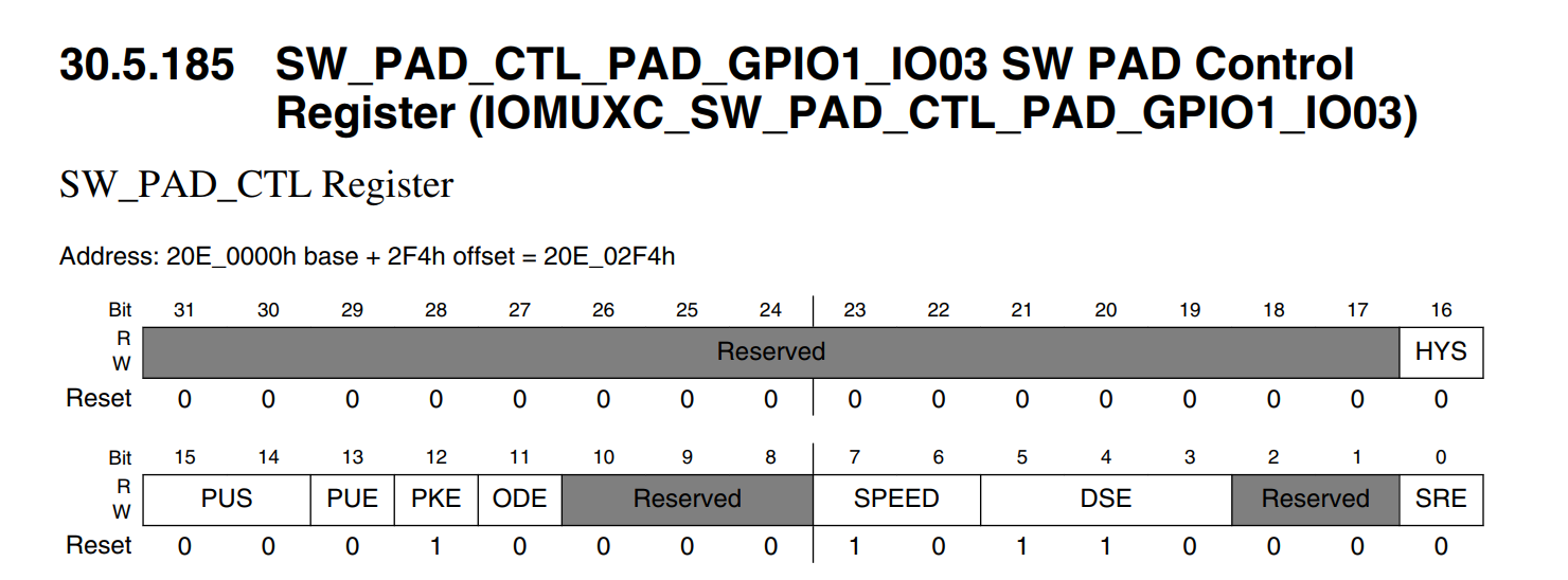 ③ 配置电气属性。IOMUXC_SW_PAD_CTL_PAD_GPIO1_IO03寄存器是设置GPIO1_3的电气属性的。重点设置压摆率、速度、驱动能力、开漏、上下拉
