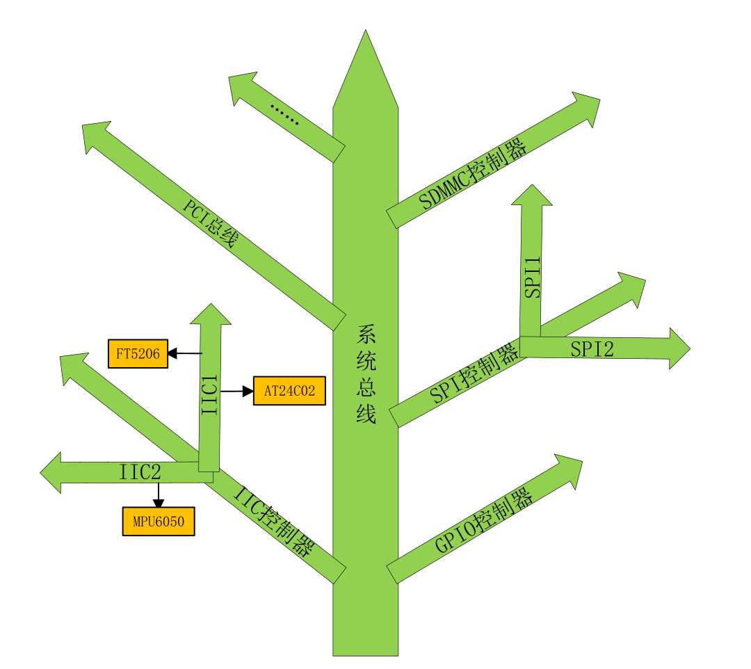 在上图中,树的主干就是系统总线,IIC控制器、GPIO控制器、SPI控制器等都是接到系统主线上的分支。IIC控制器有分为IIC1和IIC2两种,其中IIC1上接了FT5206和AT24C02这两个IIC设备,IIC2上只接了MPU6050这个设备。DTS文件的主要功能就是按照上图所示的结构来描述板子上的设备信息。